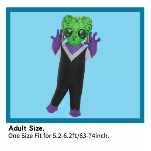 - One Size Fits Most: The deluxe version of this inflatable alien dress costume is designed to fit adults, suitable for individuals who are 5.3 to 6.2 feet (63-74 inches) tall.