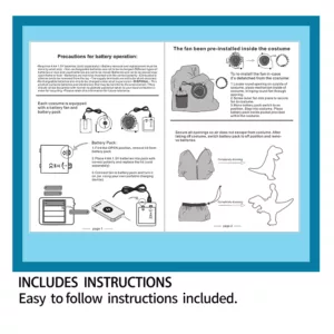 - Easy Installation and Safety Precautions: The costume inflates quickly using the included blower operated by 4 AA batteries. Please ensure the battery pack is securely placed in the designated pocket to prevent overheating. The costume will be fully inflated in just a few seconds.