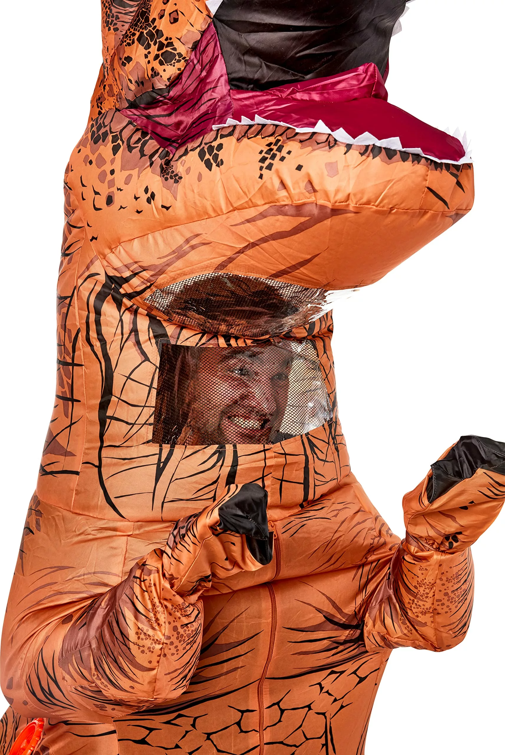 • Inflatable Design: The costume features a long-sleeve inflatable jumpsuit with a convenient zipper closure on the back. It’s designed to be both lightweight and durable, ensuring you can move around comfortably while maintaining the impressive Tyrannosaurus rex shape.