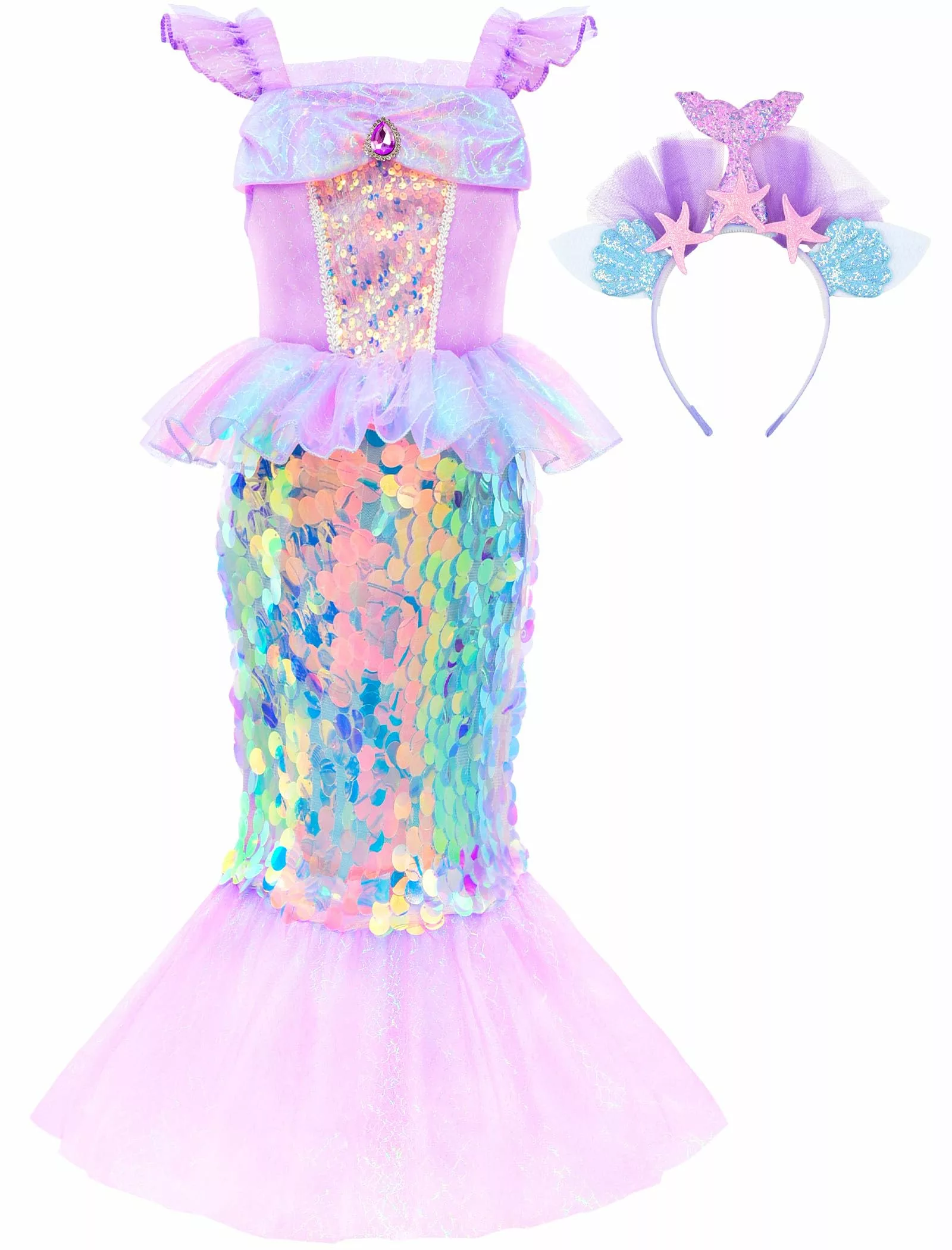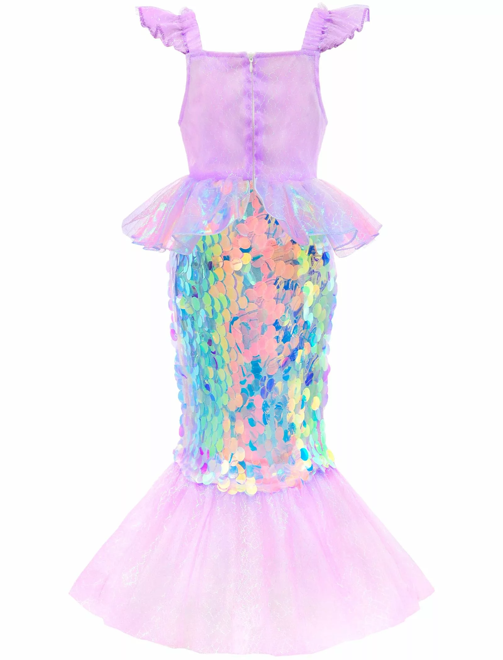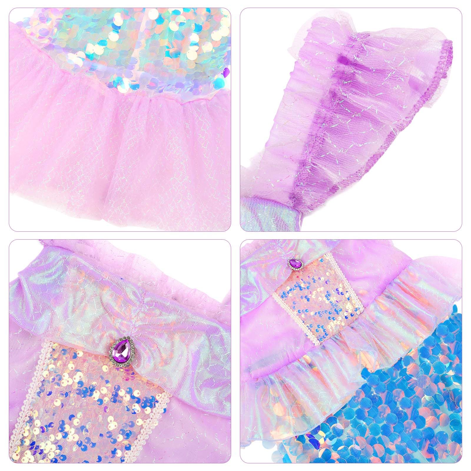 - Exquisite Design: The dress features a ruffled short sleeve with a convenient zipper design, a fin-like waist accent, and a sequined skirt. The organza ruffles around the waist and the ankle-length wide mesh fishtail hem add a touch of royal elegance, ensuring your little one feels like a true mermaid princess.