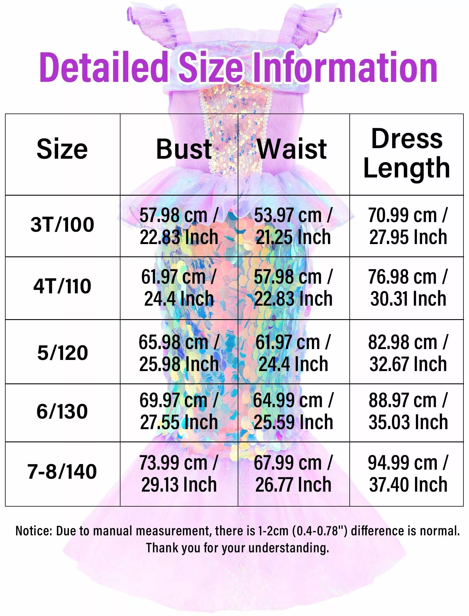 - Size Chart for Perfect Fit: To ensure the best fit for your little mermaid, please refer to our “Size Chart” before placing an order. This dress is recommended for girls aged 3 to 10 years old.