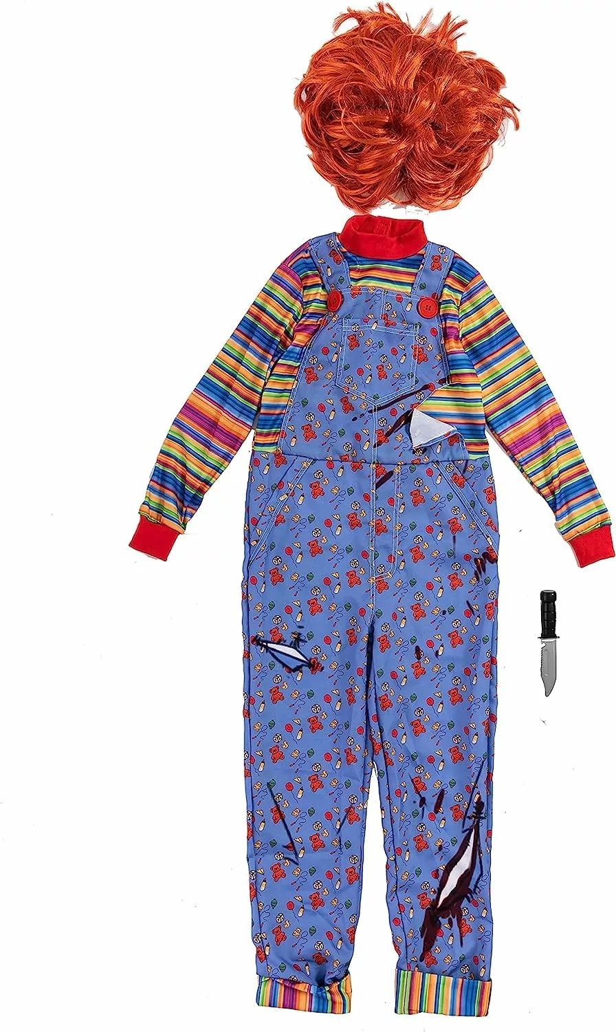 • Complete Costume Set: This eerie costume includes a dungaree attached to a striped long-sleeve top, a realistic wig, and a prop knife, providing a full look for your little horror movie enthusiast.