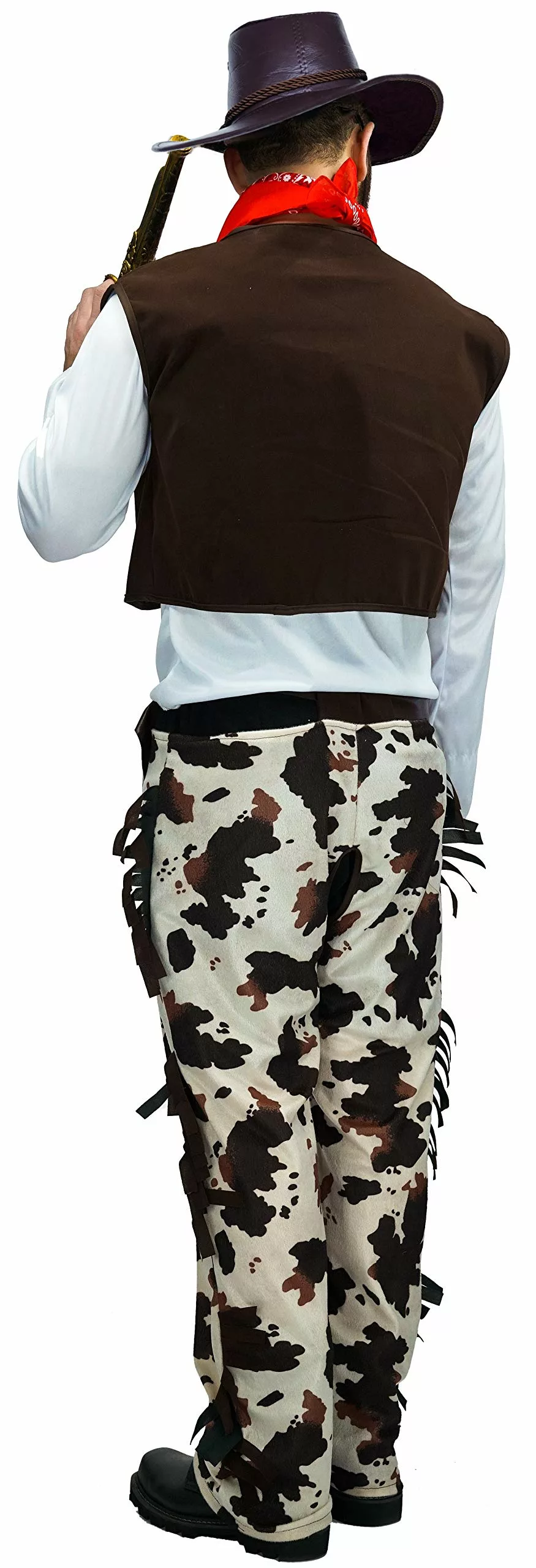 - Complete 7-Piece Set: Our deluxe cowboy costume includes everything you need for a full western look: Chaps, Belt, Vest, Neckerchief, Star Badge, Leather Whip, and Leather Hat.